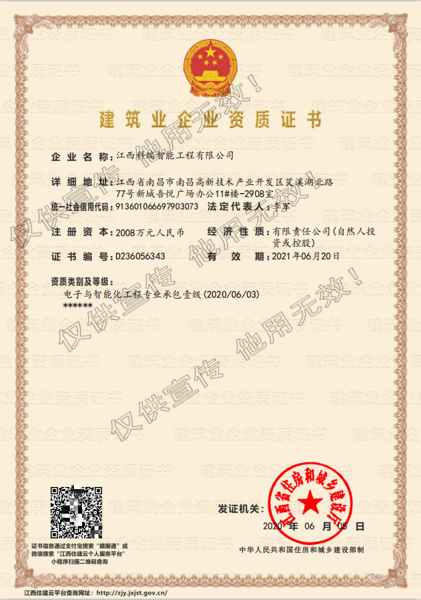 喜訊!喜訊!熱烈祝賀公司"電子與智能化工程專業承包資質證書"升級為壹級資質。